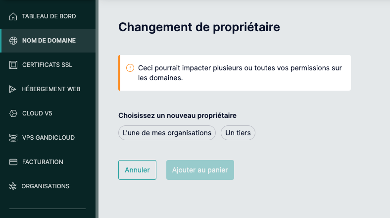 - Me: If the domain is currently under a "professional" organization (i.e. a company), you can change the owner to your natural person organization. NOTE: if the domain is already under your personal organization, this choice will not be displayed.