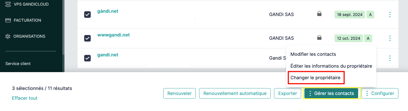 - Tick the boxes to the left of the domains you wish to transfer to a new owner.