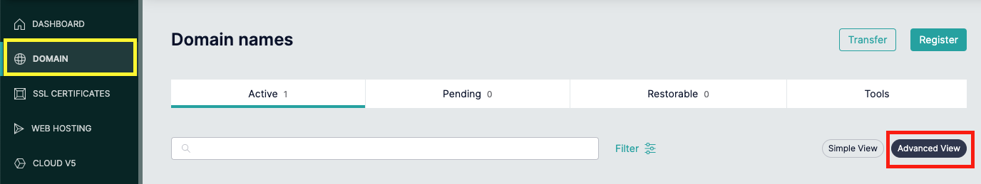En el menú NOMBRE DE DOMINIO, cambie a la Vista Avanzada y gestione varios dominios a la vez.
