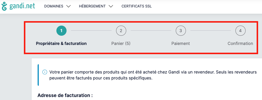 A cette étape, vous trouverez le détail des différentes opérations à payer (enregistrement, renouvellement, création d’Hébergement Web, etc.), présentées séparément. L'adresse de facturation est également affichée dans la rubrique "Adresse de facturation" et peut encore être modifiée à ce stade en cliquant sur " Changer ".