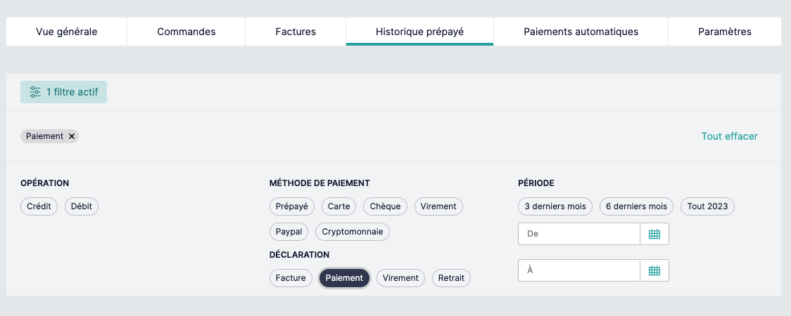 Ces reçus sont disponibles dans l’onglet « Historique prépayé », pour y accéder, il suffit de se rendre sur la page "Historique des prépayés" et de cliquer sur "Filtres" (situé sous l'onglet "Vue générale"). Ensuite, dans la rubrique qui s'ouvre, sélectionnez "Paiement" dans la rubrique "Déclaration". Cela affichera tous les reçus dans l'ordre chronologique.